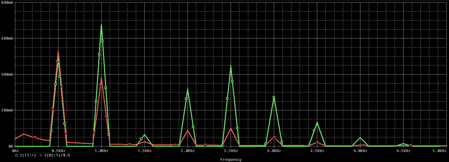 下圖顯示了一個簡單的瞬態(tài)分析,它比較了源電流波形(綠色)和負(fù)載電流(紅色)。我們可以看到瞬態(tài)響應(yīng)在前約1 ms內(nèi)消失,并且負(fù)載處的波形在以后的所有時間都保持一致。顯然,信號電平會有所衰減,但這主要是由于Pi網(wǎng)絡(luò)和負(fù)載的綜合阻抗,而不僅僅是負(fù)載本身。