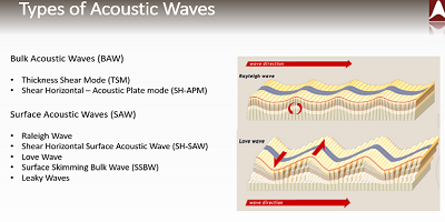 交替發(fā)生的機械變形會產(chǎn)生聲波,并以每秒4,00012,000米的速度傳播。取決于金屬-壓電結(jié)構(gòu)的細節(jié),聲波可被引發(fā)以在表面上流動或通過壓電體。實際上,即使在表面聲波(SAW)和體聲波(BAW)類別中,也存在一系列具有不同特性的聲波 (圖4