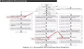 下圖顯示了S12核心CPU中斷堆棧過(guò)程,按下CCR?寄存器,關(guān)閉全局中斷處理,箭頭中的紅色圓圈,硬件設(shè)置了I-BIT(禁用I位外設(shè)中斷),S-BIT(禁止),低功耗指令STOP)和X位(禁止XIRQ中斷)(注:此過(guò)程是用戶(hù)無(wú)法控制且不可中斷的原子操作)