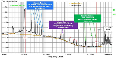 請注意,上圖中的強(qiáng)烈毛刺是由多種原因引起的??梢詫⑸鲜鲈肼暸c電路板上相關(guān)組件的參考規(guī)格進(jìn)行比較??梢酝ㄟ^以-10 dBc / Hz的斜率穿過相位噪聲規(guī)范點(diǎn)來畫一條線來完成。超過此線的噪聲頻譜的任何部分都將落在允許的相位噪聲容限之外,并且需要在設(shè)計(jì)中加以抑制。